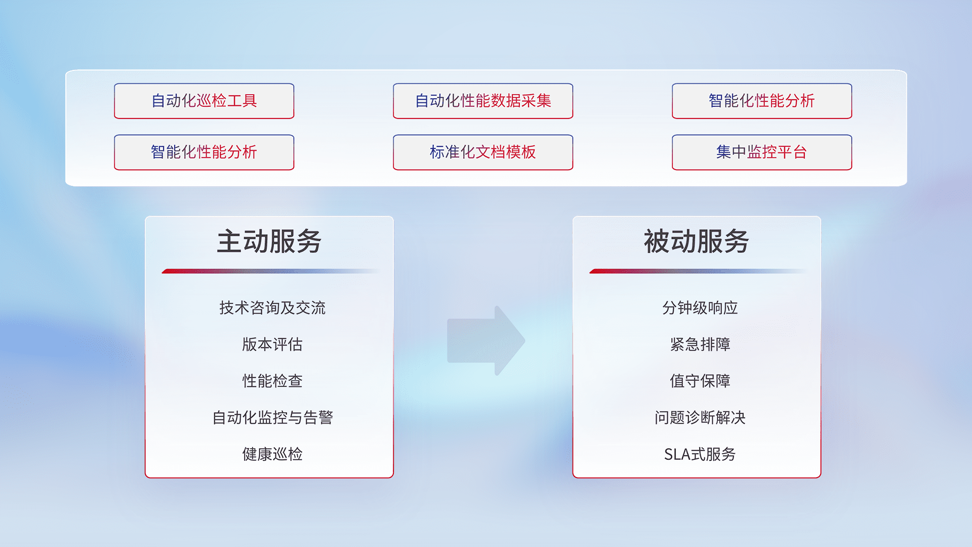 智能化工具和标准化文档,,,保障服务质量,,提供主动服务(包含技术咨询、、、版本评估、、性能检查、、、自动化监控与告警、、健康巡检)和被动服务包含(分钟级响应、、紧急排障、、、值守保障、、、问题诊断解决、、、、SLA服务)。。